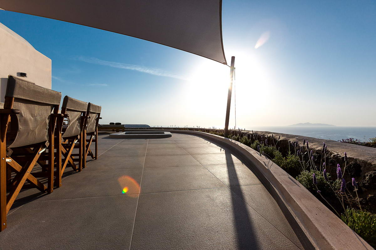 The hot spot of the Villa with a dining cement table up to 8 people, Big Jacuzzi with heated water, 4 deckchairs, shower & amazing view of the Aegean Sea.